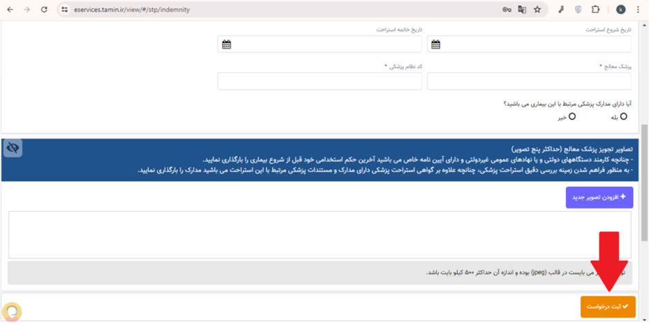 ثبت درخواست: پس از تکميل فرم، بر روي گزينه “ثبت درخواست” کليک کنيد. اين گزينه معمولاً به صورت زرد رنگ در پايين صفحه و سمت راست قرار دارد.
